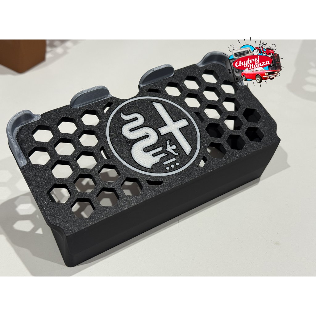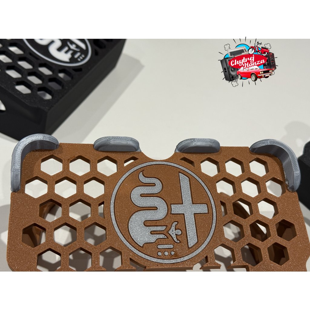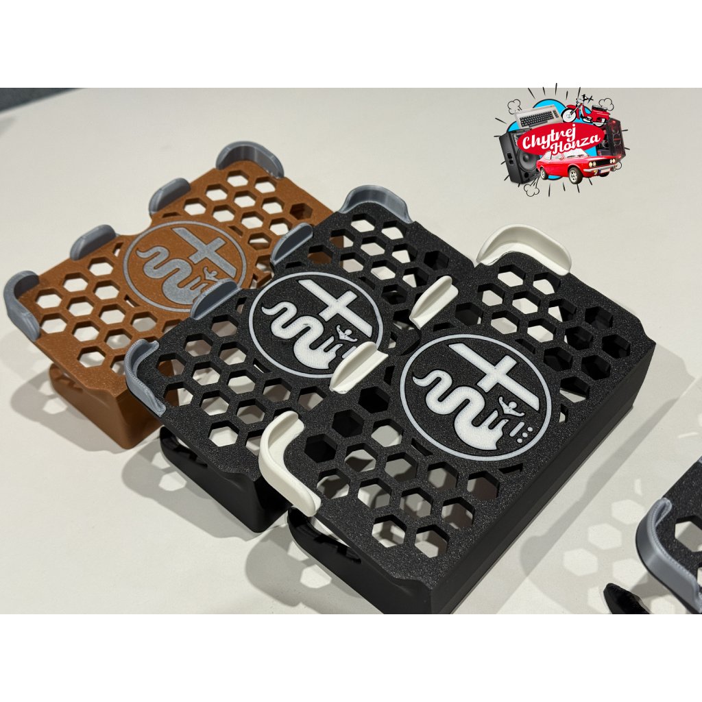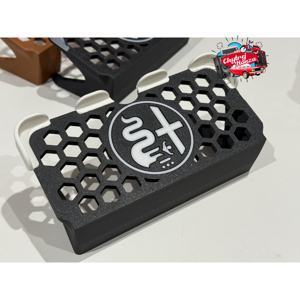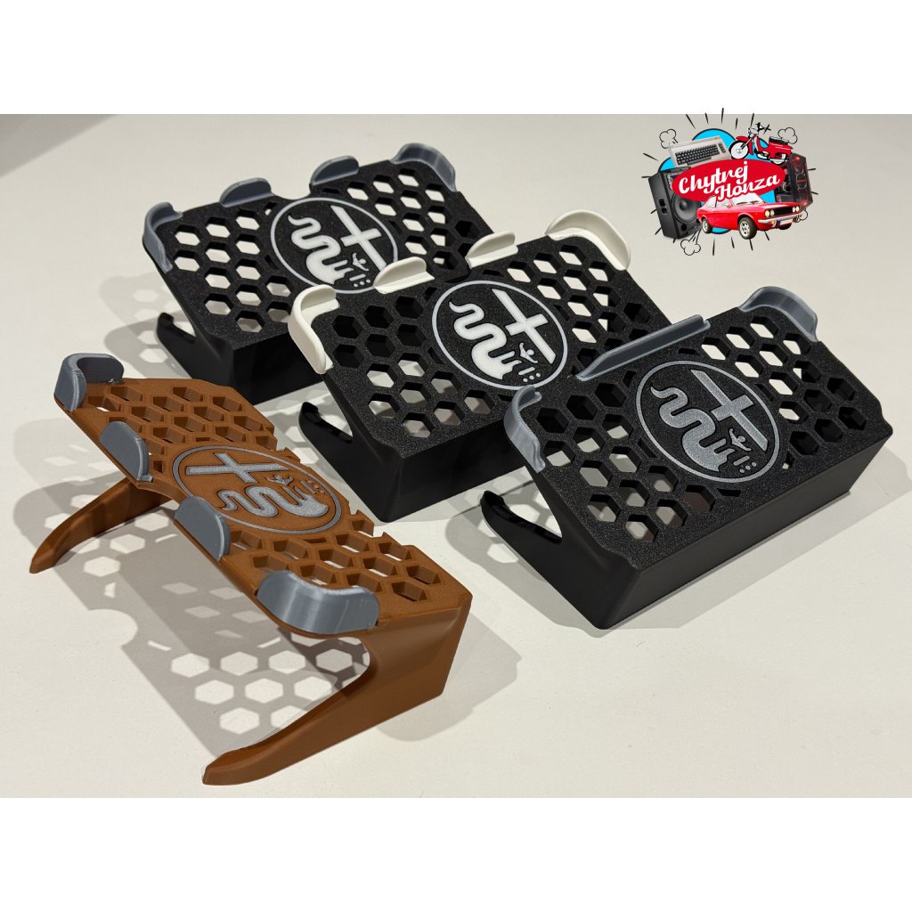 Držák je vytisknut z materialu PLA matt + je možnost změnit barvu loga a vodítek. Doporučuji nechat kombinaci černo - šedou viz foto. černo - bílá se za čas více špiní. Pro zajímavost dávám i kombinaci např. hnědo - šedou. Uprostřed je výřez na prst na vyndání telefonu.