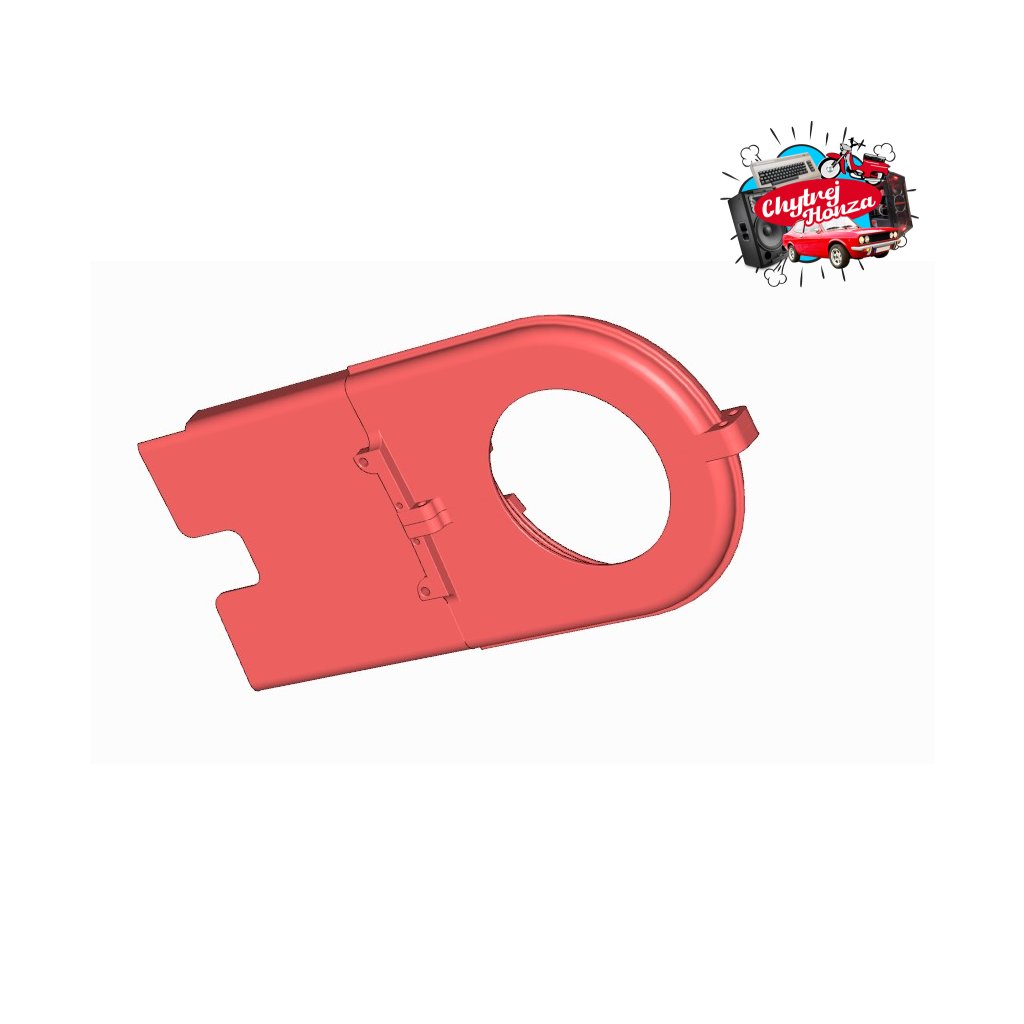 Proto jsem vyvinul kryt rozety pro tuto motorku – tvarově podobný originálu, ale konstrukčně řešený tak, aby i při problému (nehoda, povolení šroubu, upadnutí krytu) nehrozilo pořezání ani úraz.